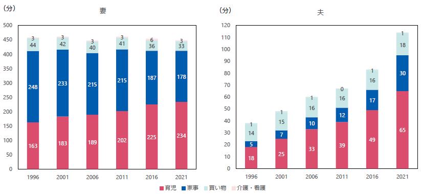 家庭で担う“無償労働”の多くは女性にのしかかっており、男性との分担が進んでいない現状を示しています。