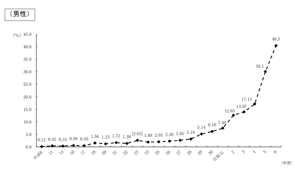 厚生労働省が実施した2024年度雇用均等基本調査によると、民間企業における男性の育児休業取得率は 40.5% に到達しました。これは、2023年度の30.1%から10.4ポイント増加と、大きく伸びています。
